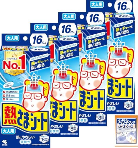 熱さまシート 【まとめ買い】大人用 冷却シート 肌にやさしい 弱酸性 16枚×4個 メガネクリーナおまけ付 【Amazon.co.jp限定】